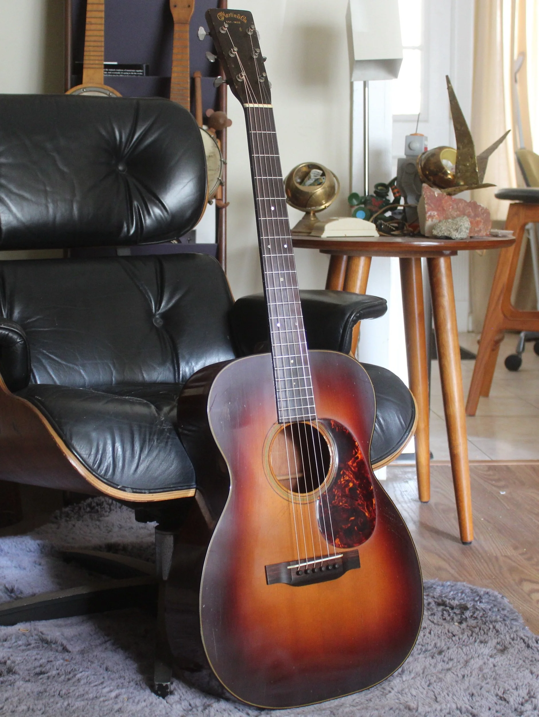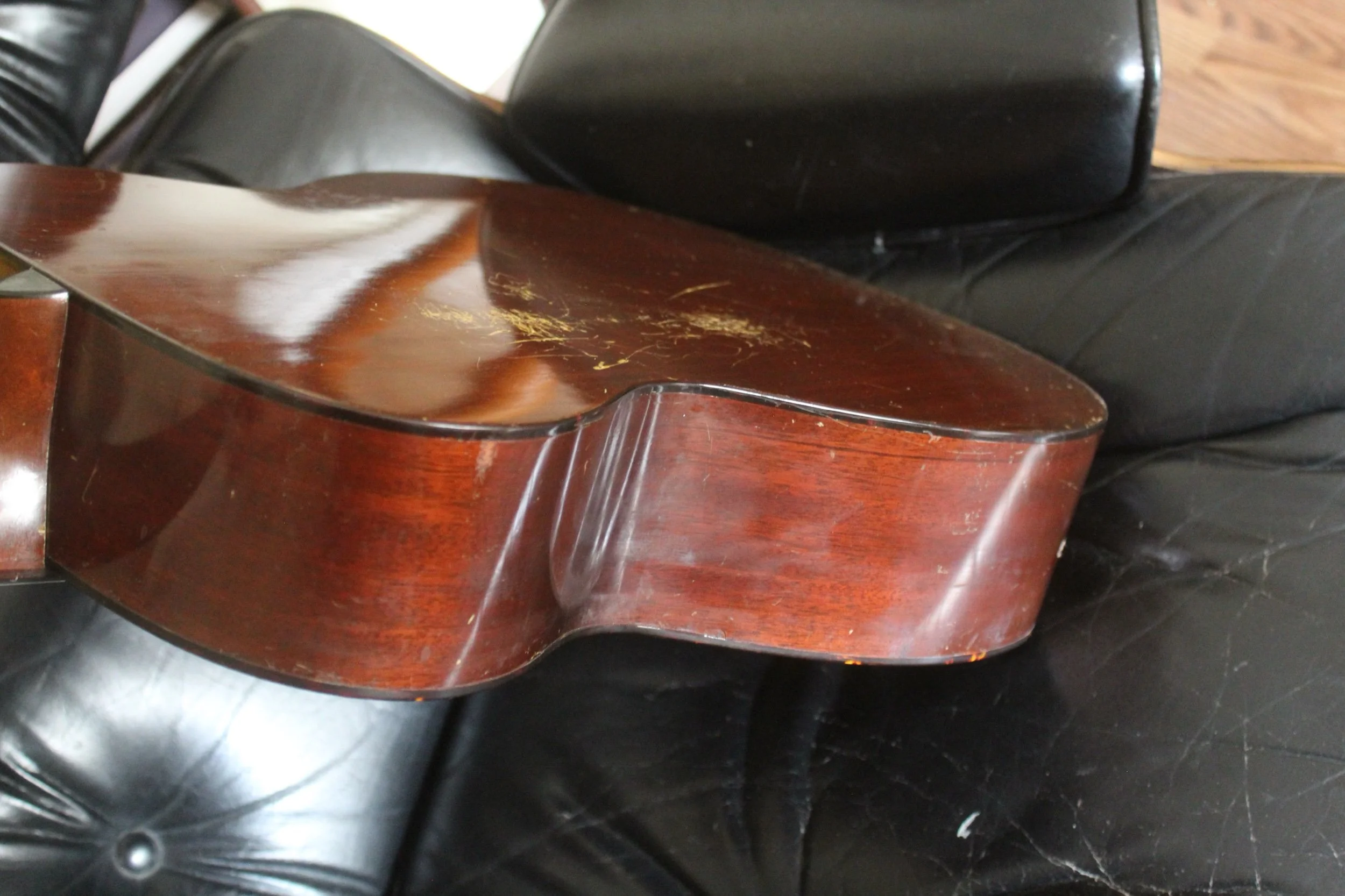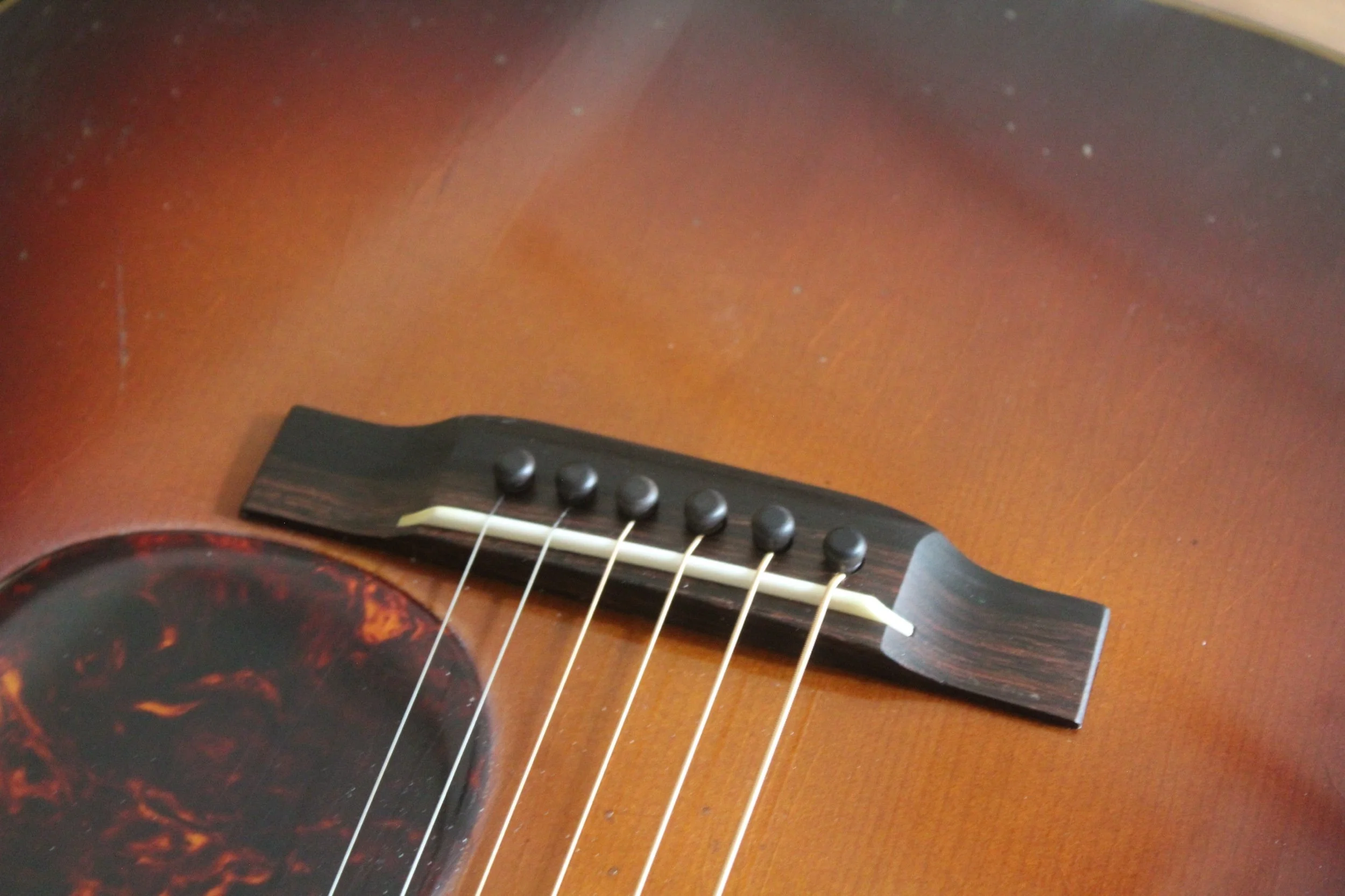Here we have great 1935 Martin R-18 archtop that has been converted to a style 18 The conversion was done by Joel Whitehead. The guitar tuners are not origanal to the guitar but our old Grover tuners. dot inlays are original.