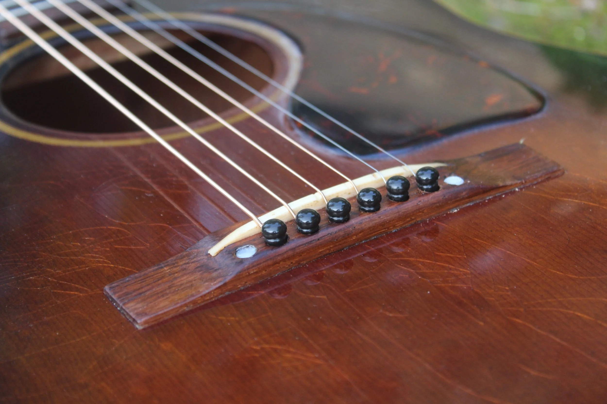Here we have a super cool 1940s Gibson banner J 45. As you'll notice the guitar is in good condition things that have been done to this instrument guitar has recently been restored guitar has been completely refinished with nitro cellulose lacquer that has been aged accordingly, and tortoise lacquer incelluloid pick guard this instrument guitar has also had a neck reset re-correcting the geometry and play ability of this instrument guitar has also had a complete re fret along with a new bone nut and small maple bridge plate. Guitar still does obtain its original rosewood bridge along with bone saddle that has been saved. The guitar has non-original 60s kluson tuners and Farrell heads as you will notice from the photos that I have provided. All interior bracing is original number 1,2,3 back braces have been re-glued at eyelids. Guitar has old crack repairs to the back that appeared to be solid before refinishing so we're left alone. This guitar sounds unbelievable. I'm not just saying that to sell it. It's definitely something special. The guitar does have lots of little nicks chips, dings dents, and superficial blemishes all over it as you'll notice from the photos that I provided. Please feel free to ask any other questions you might have.